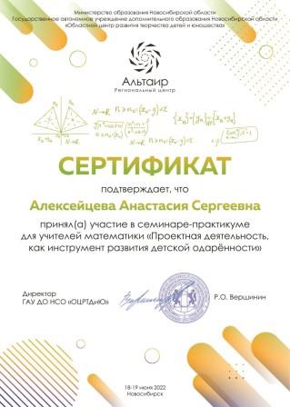 Сертификат участника семинара-практикума для учителей математики "Проектная деятельность как инструмент развития детской одаренности" 18.06.2022-19.06.2022 г.