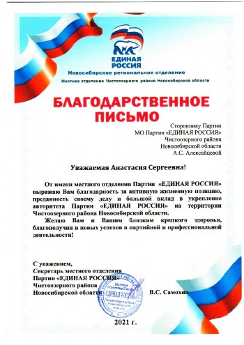 Благодарственное письмо за активную жизненную позицию, преданность своему делу и большой вклад в укрепление авторитета партии "Единая Россия" (Местное отделение Чистоозерного района Новосибирской области) 2021 г.