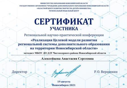 Сертификат участника Региональной научно-практической конференции 19.08.2021 г.