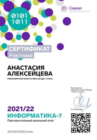 Сертификат участника Пригласительного школьного этапа по информатике 2021-2022