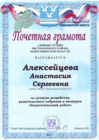 Почетная грамота за лучшую разработку родительского собрания в конкурсе "Педагогический дебют" 2015 г.