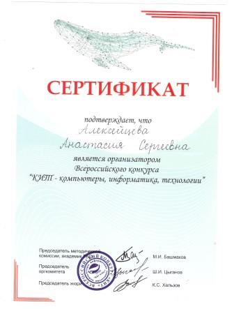 Сертификат организатора Всероссийского конкурса "КИТ - компьютеры, информатика, технологии"