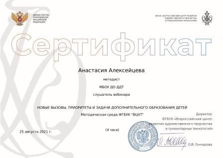 Сертификат слушателя вебинара "Новые вызовы, приоритеты и задачи дополнительного образования детей"
