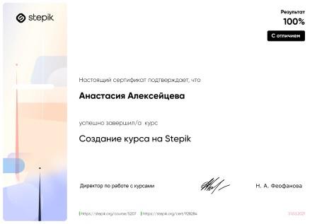 Сертификаты участника онлайн-курсов "Основы волонтерства для начинающих" и "Создание курса на Stepik", март 2021 г.